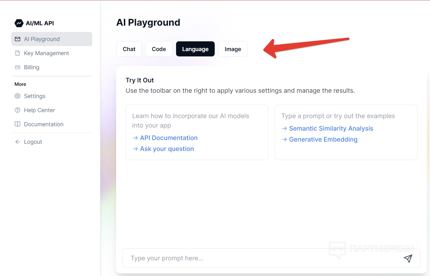 После успешной регистрации вы попадете в свой пользовательский кабинет. Здесь вам будет доступен широкий спектр инструментов и моделей искусственного интеллекта. Интерфейс кабинета интуитивно понятен, что позволяет легко ориентироваться и находить нужные функции. Вы сможете сразу приступить к использованию более чем 100 моделей ИИ, доступных через единый API.
