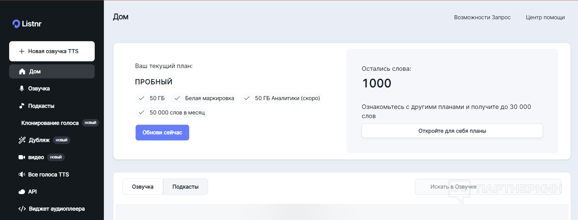 На главной странице отображается общая информация о вашем аккаунте и доступных возможностях. Здесь вы найдете текущий тарифный план и доступное количество слов для озвучки. Также в этом разделе представлены подкасты и озвучки других пользователей, что позволяет оценить разнообразие и качество контента, создаваемого с помощью