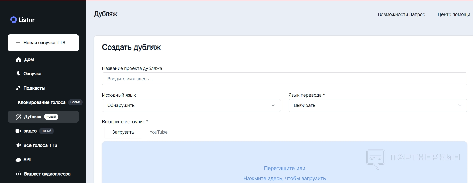 - Дубляж аудиоконтента — функция дубляжа позволяет переводить аудиоконтент на другие языки, что делает контент доступным для международной аудитории. Это включает выбор целевого языка и голоса для перевода, что упрощает создание мультиязычных версий аудиофайлов.