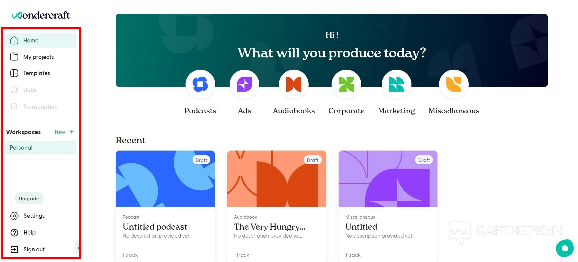 После регистрации пользователь получает доступ к личному кабинету. Там он может создавать подкасты с помощью шаблонов, управлять проектами, менять тарифные планы. Инструментарий платформы выполнен в формате минимализма. Меню располагается с левой стороны. При выборе любого раздела информация отображается в центре экрана.