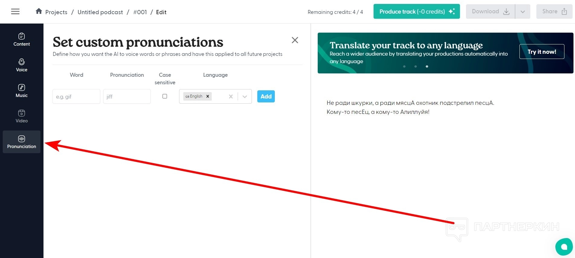 • Pronunciation. Настройка произношения. Как ИИ будет озвучивать фразы. Можно добавить или удалить языки. В разделе Word добавьте основное слово. В раздел Pronunciation добавьте, как вы хотите, чтобы оно звучало. В конце нажмите на ADD , чтобы добавить произношение в библиотеку.