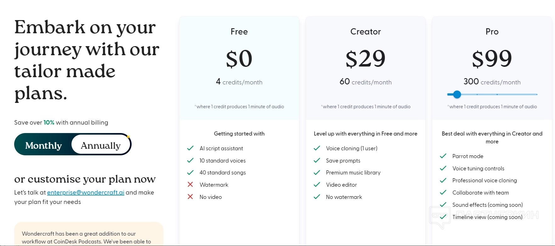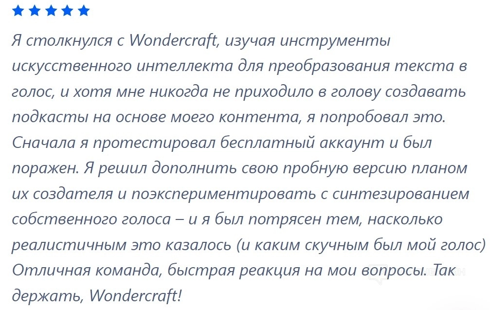 представляет собой мощный и универсальный инструмент, который полностью отвечает запросам маркетологов, блогеров и рекламщиков. Платформа пользуется высокой оценкой благодаря широкому выбору инструментов для генерации аудио. Особенно ценится наличие бесплатного плана, который позволяет новым пользователям протестировать основные функции сервиса без финансовых затрат. Кроме того, Wondercraft AI известен своей качественной службой поддержки, которая быстро и эффективно решает любые возникающие вопросы.