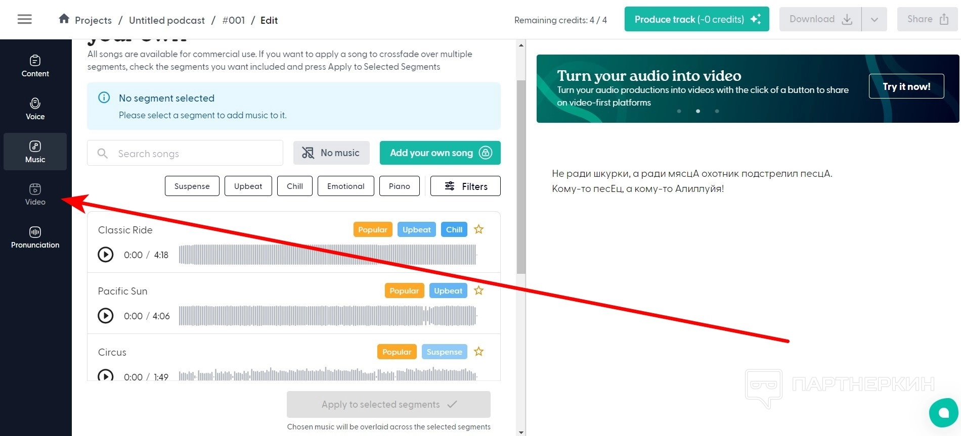 • Video. Инструмент, доступный в платных подписках. Дает возможность загружать и генерировать ролики для подкастов и рекламы.