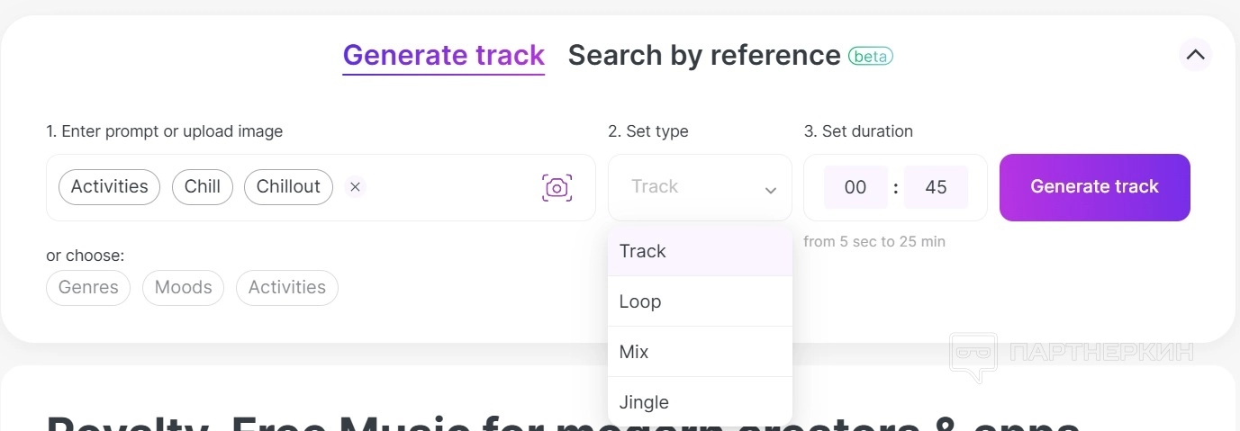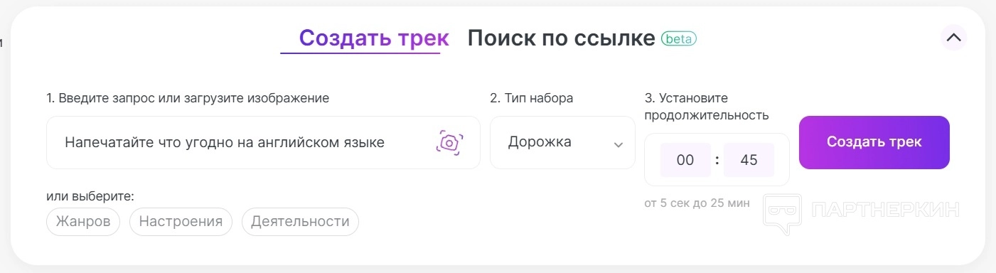 Можно выбрать жанр, настроение, режим, например трек или джингл, продолжительность мелодии.