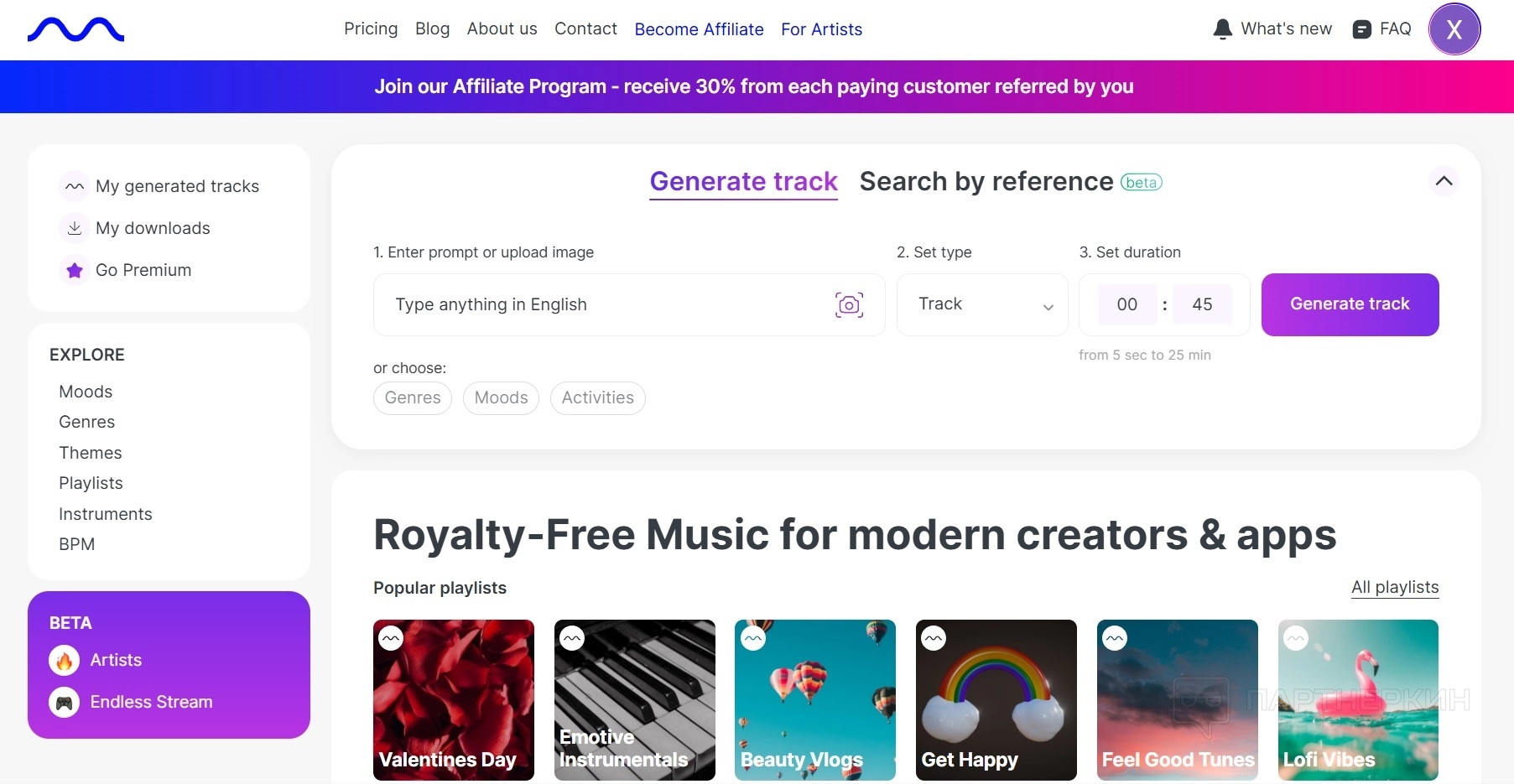 В личном кабинете можно сразу попробовать возможности сервиса и получить музыку, нажав на Generate Track.
