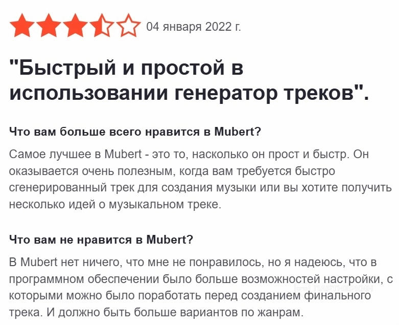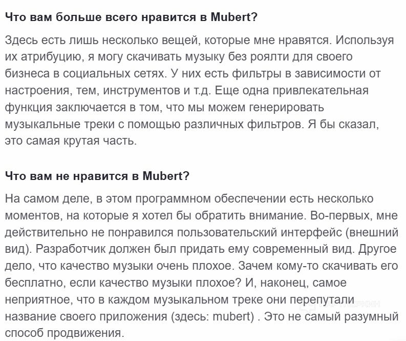 Пользователям нравится возможность генерировать музыку без роялти, наличие разных фильтров. Кому-то может показаться неудобным и непривычным интерфейс, но всё равно достоинств выделяют больше, чем недостатков: