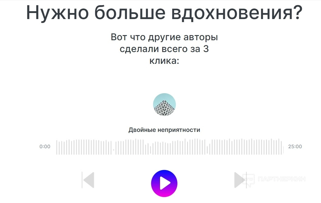 - Создание саундтреков с искусственным интеллектом, который будет соответствовать настроению и продолжительности контента. Саундтрек создается за несколько секунд, генерируется легко, от пользователя не требуется знаний музыкальной грамоты или аудиоредакторов.