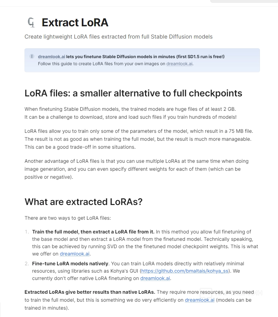 Dreamlook.ai предоставляет пользователям возможность извлекать файлы LoRA из полностью обученных моделей.
