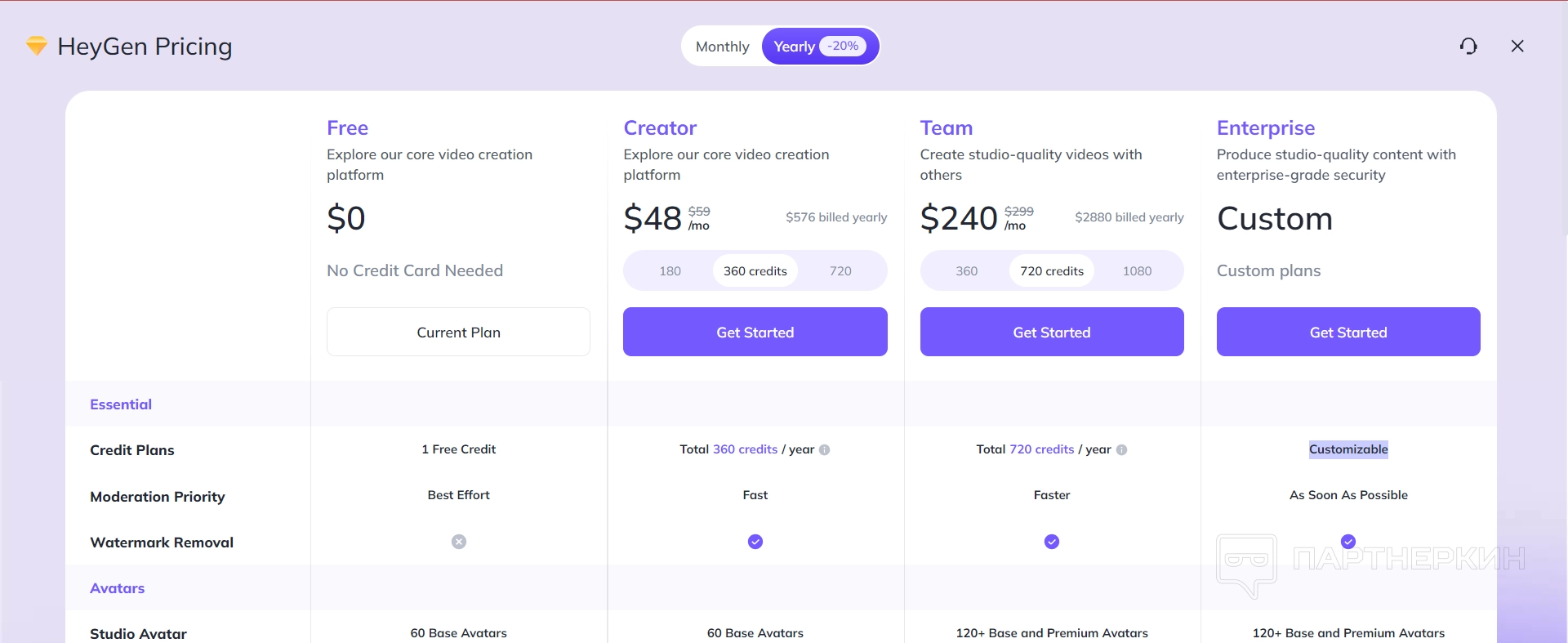 - 60 базовых аватаров: все те же базовые аватары, что и в бесплатном плане, но с большим количеством кредитов для их использования, что позволяет создавать больше видео и экспериментов с контентом.