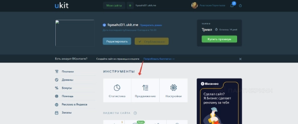 Продвижение — чтобы продвигать свой сайт, сервис предлагает несколько полезных инструментов, среди которых:
