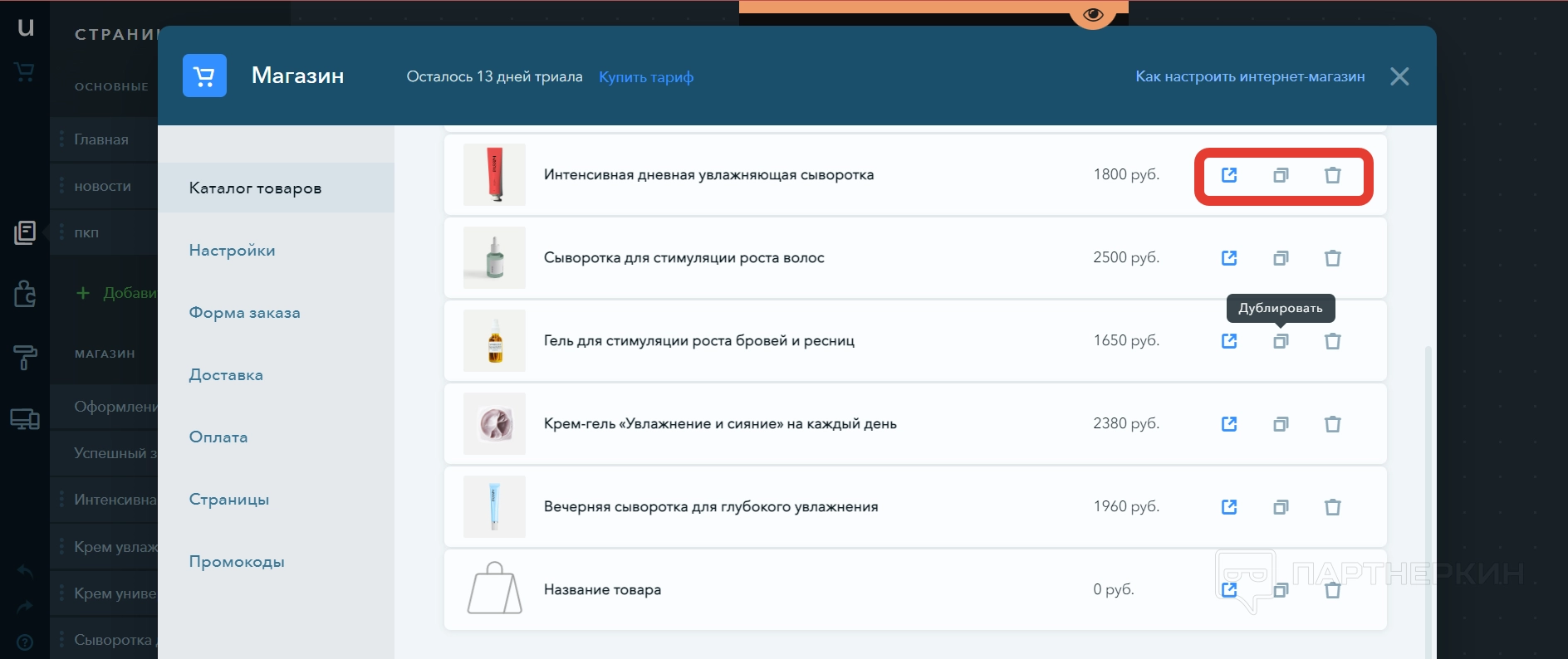 Каталог товаров — в этом подразделе можно управлять списком своих товаров. Среди основных функций — просмотр страницы товара, удаление и дублирование. Так как все товары стоят по умолчанию, их можно просто удалить. Создание нового товара происходит через виджет «Товар магазина» в конструкторе — там при добавлении любой карточки она автоматически попадает в каталог.