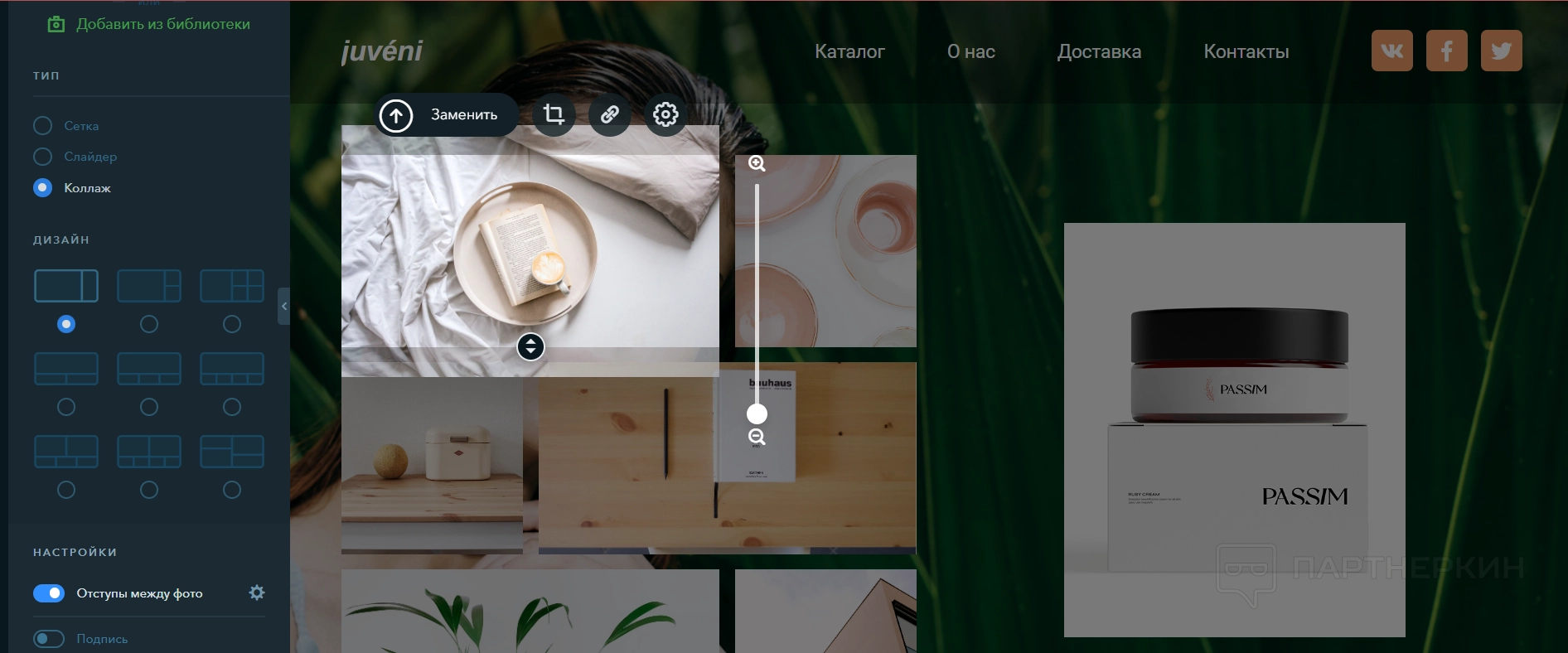 В этих настройках пользователь может добавить свои изображения с устройства или из библиотеки конструктора и изменить оформление галереи на сетку, слайдер или коллаж. В зависимости от вида галереи будут отличаться и дальнейшие настройки.