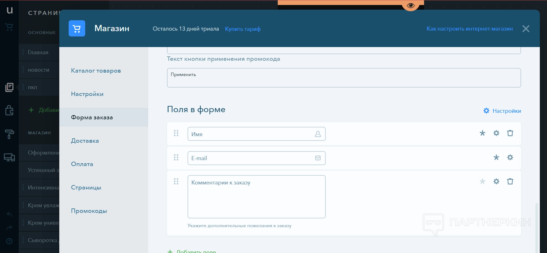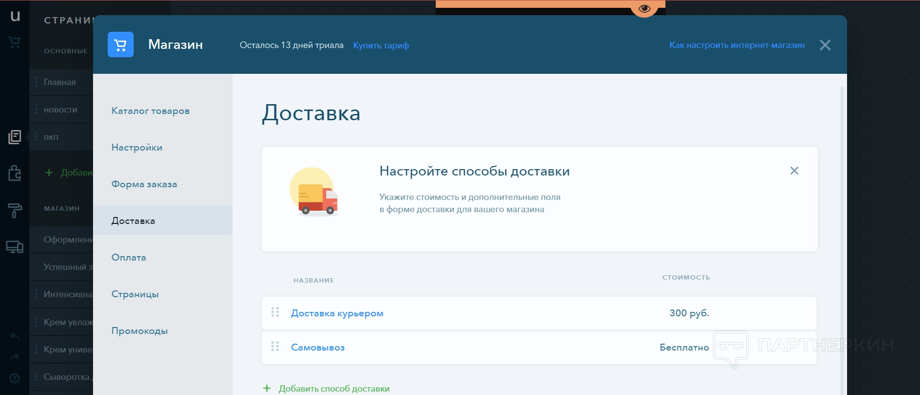 Доставка — здесь пользователи могут настроить, как будет выглядеть поле с оформлением доставки. При этом тут можно указать сам вид доставки и его стоимость. По умолчанию стоит курьерская и самовывоз — если на них щелкнуть, можно отредактировать содержание. При необходимости есть поле внизу, чтобы добавить новый способ доставки.