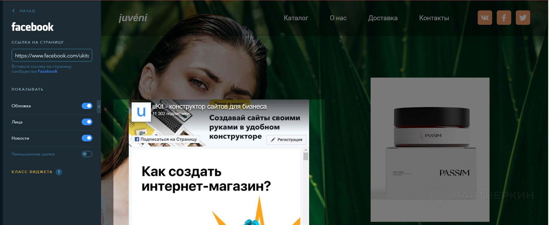 - Facebook* — через этот виджет можно добавить рандомную запись со стены сообщества соцсети на сайт для быстрого перехода. Чтобы настроить его, нужно указать саму ссылку на аккаунт или запись, а также отметить, что будет показываться — обложка, лица и новости;