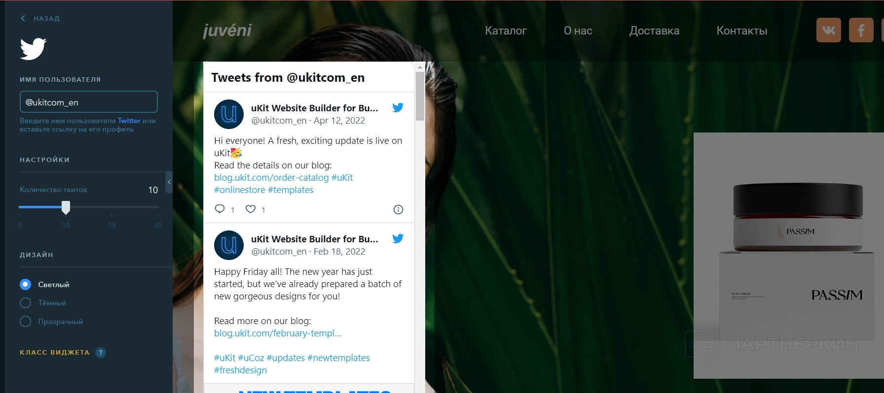 - Твиттер — этот виджет позволяет транслировать на страницу определенные твиты пользователя. Чтобы использовать его, нужно указать ссылку на Твиттер или имя пользователя, а также количество твитов, которые должны показываться. По желанию, можно выбрать вариант дизайна карточки;