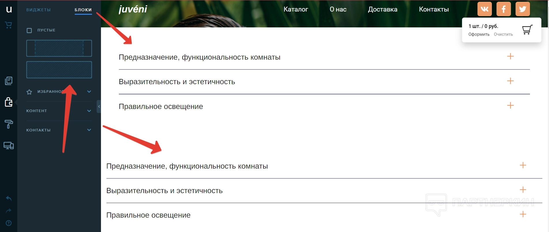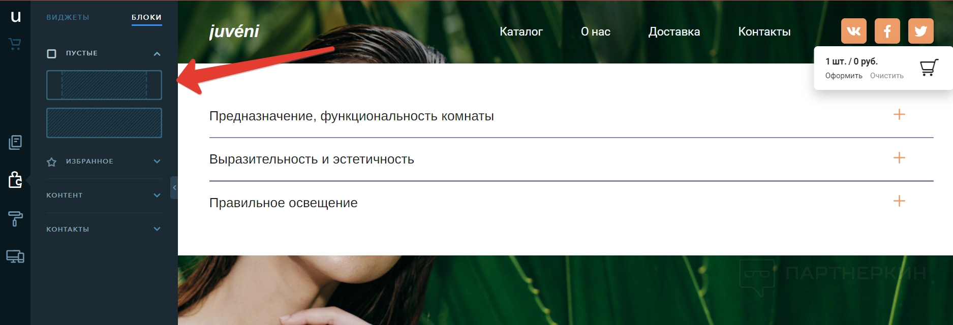 Шапка и подвал — с помощью этого подраздела можно добавить на страницу хедер и футер. Выглядят они как небольшие пустые фрагменты, которые по цвету соответствуют фону страницы.