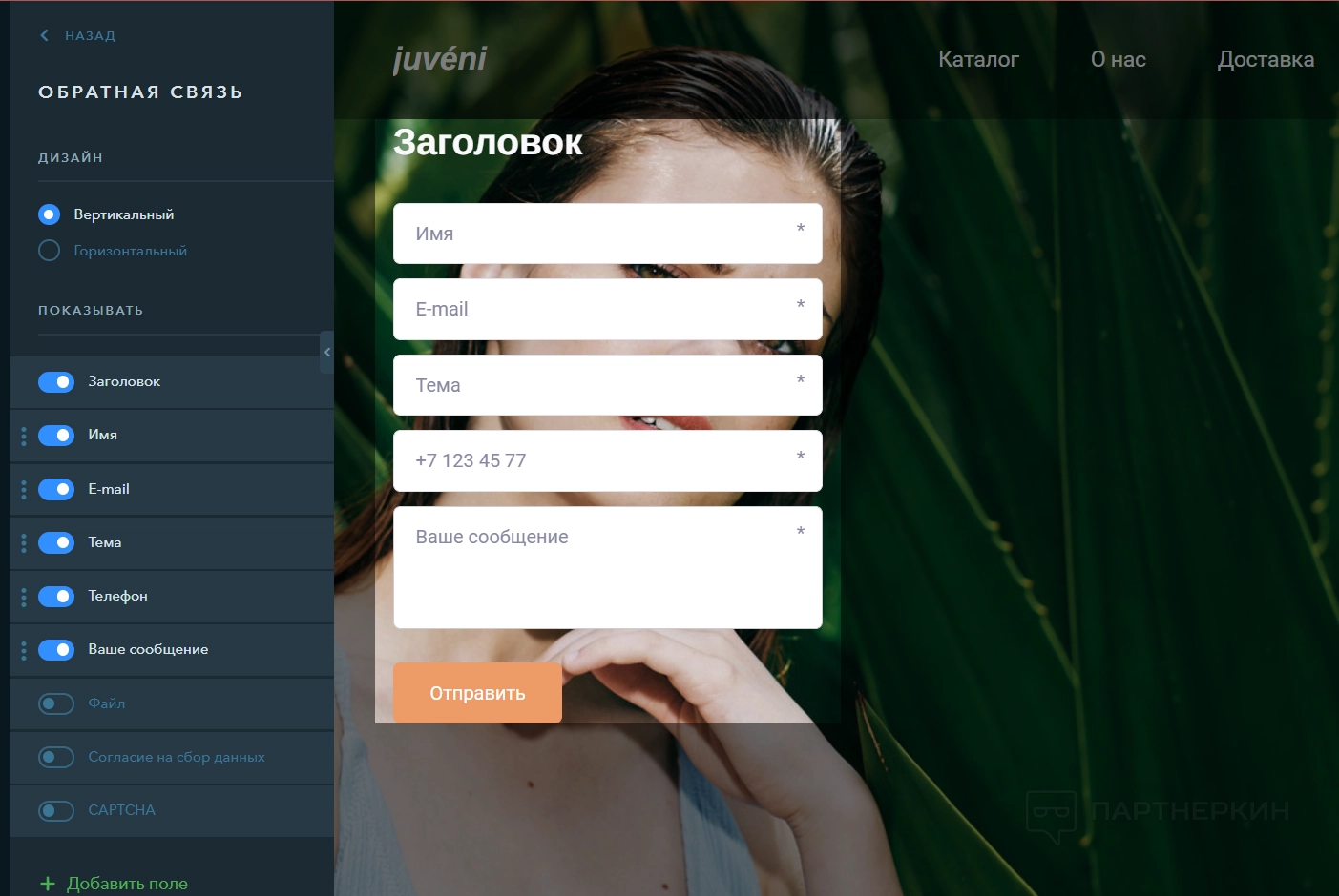 - Обратная связь — с помощью виджета можно добавить форму обратной связи на страницу. Из данных нужно указать, какая ориентация будет у формы, а также, какие блоки в ней будут: заголовок, имя, почта, тема обращения, номер телефона, текст сообщения, медиафайл, согласие на обработку данных и прохождение капчи. Можно добавлять и собственные поля в форму;