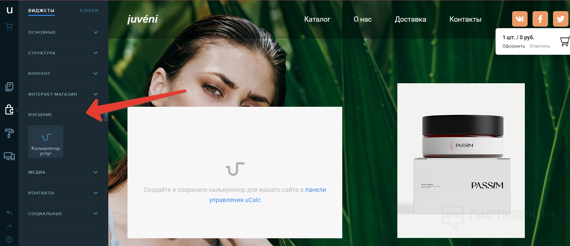 Внешние — в этом подразделе можно добавить виджет в виде калькулятора услуг. Чтобы настроить его, нужно либо привязать аккаунт к учетной записи uCalc, либо создать новую и привязать к ней аккаунт.