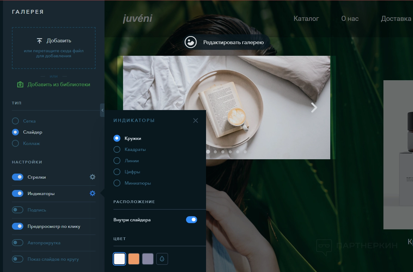 Если выбрать тип «Слайдер», то тогда пользователь может настроить стрелки на нем, их стиль оформления и цвет. Также здесь можно отметить наличие индикаторов под изображениями, подписей и возможность предварительно просматривать картинку по клику, автоматически прокручивать их или показывать по кругу.