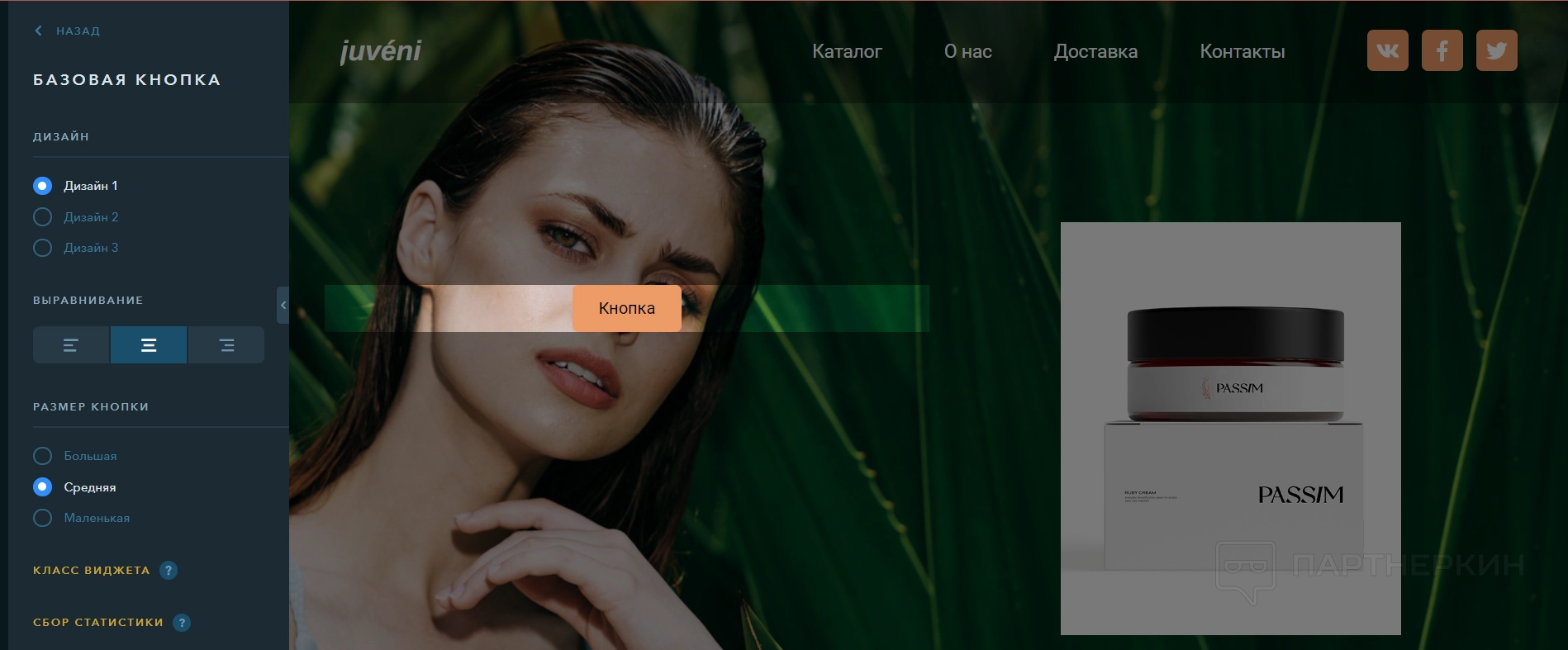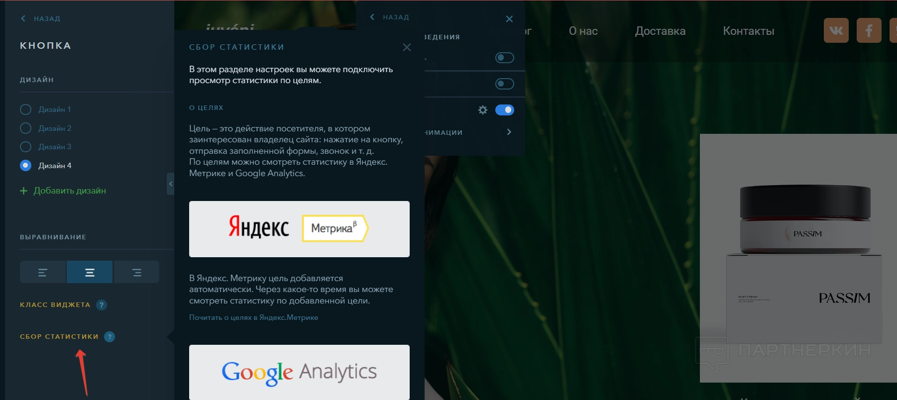 Остальные функции меню — это выравнивание кнопки, добавление ссылки, а также сбор статистики. Последняя функция позволяет собирать статистику по кликам, что важно для оценки конверсии.