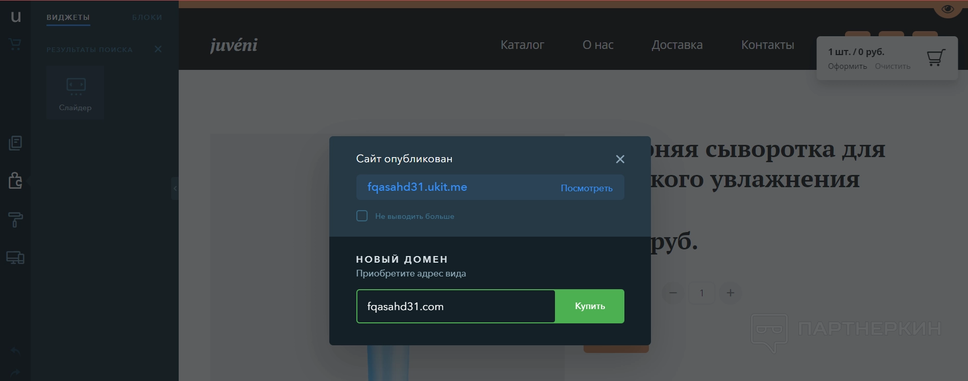 После того, как пользователь закончил свою работу над сайтом, он может опубликовать его. По умолчанию будет стоять ссылка с доменной зоной самого сервиса — .ukit.me. Но необязательно оставлять именно такой адрес — можно быстро привязать домен через сервис.
