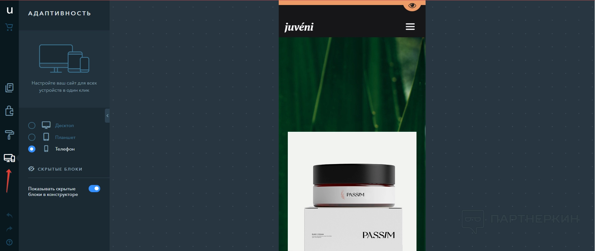 Адаптация сайта — это заключительный в списке раздел, с помощью которого можно посмотреть, как страница будет выглядеть на десктопе, телефоне или планшете. В зависимости от того, как отображается страница, можно ее слегка скорректировать в конструкторе, чтобы адаптивность стала лучше.