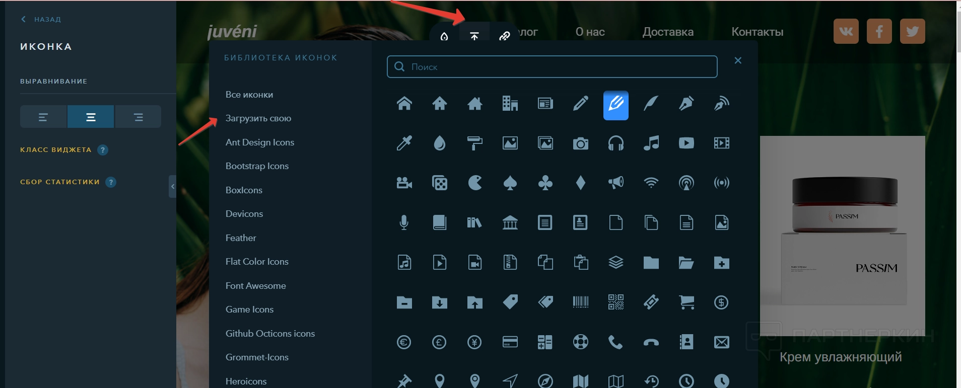 Последний виджет в подразделе — это «Иконки». С его помощью можно добавлять отдельные иконку к тексту, чтобы разделить его, или отмечать собственные соцсети, например. Кроме того, можно выгружать и собственные иконки, чтобы использовать их по странице или залить логотип компании и добавить его в меню.