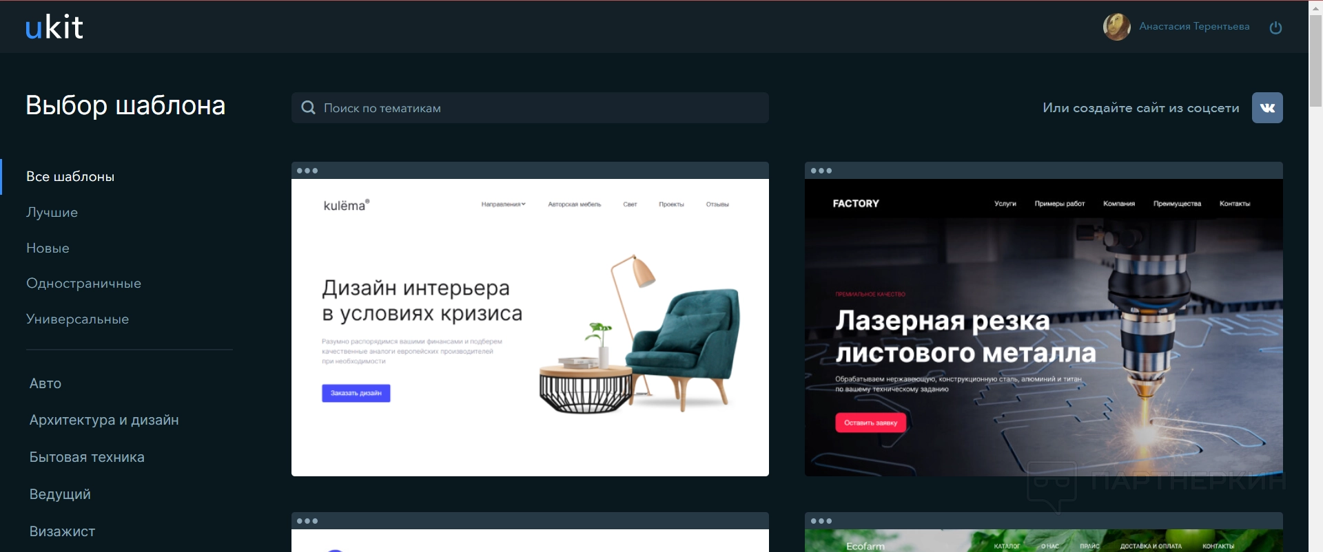 | Можно переводить личные страницы Вконтакте или на Facebook* в готовые сайт полностью бесплатно или в стоимость подписки после окончания триала. | Не все шаблоны подходят под современные цели — некоторые их них выглядят немного не актуально, но если покопаться, то можно найти что-то интересное. |