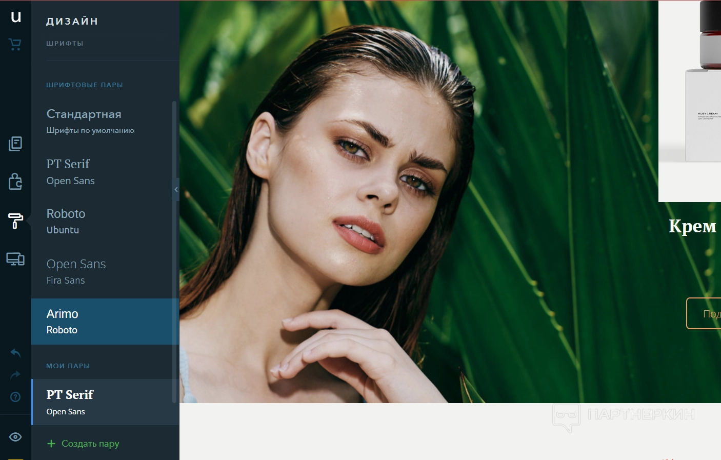 Шрифты — здесь пользователь может определить, какие шрифты будут применяться на странице. При этом можно задать пару шрифтов из предложенных, чтобы разнообразить шрифт. Там уже можно подробно настроить не только сам шрифт, но и его размер с жирностью. К сожалению, в списке не так много вариантов — всего пять видов.