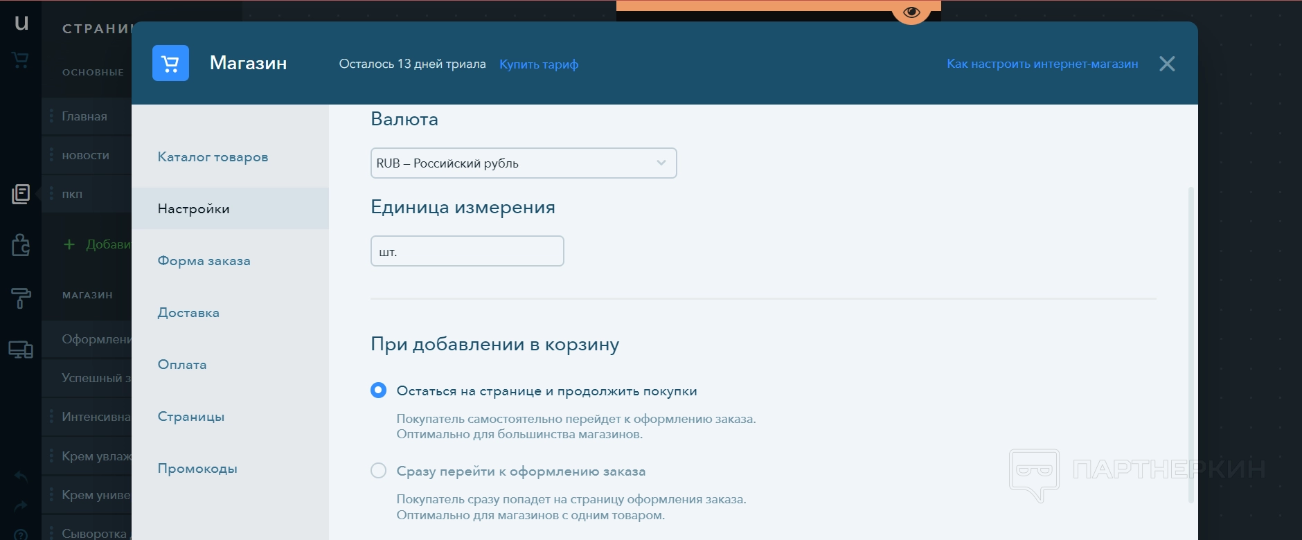 Настройки — в этом подразделе можно настроить валюту для оплаты товара, единицу измерения товара, а также то, что будет происходит со страницей клиента при добавлении товара в корзину. Например, он будет либо сразу переходить к оформлению, либо останется на странице и продолжить покупки.