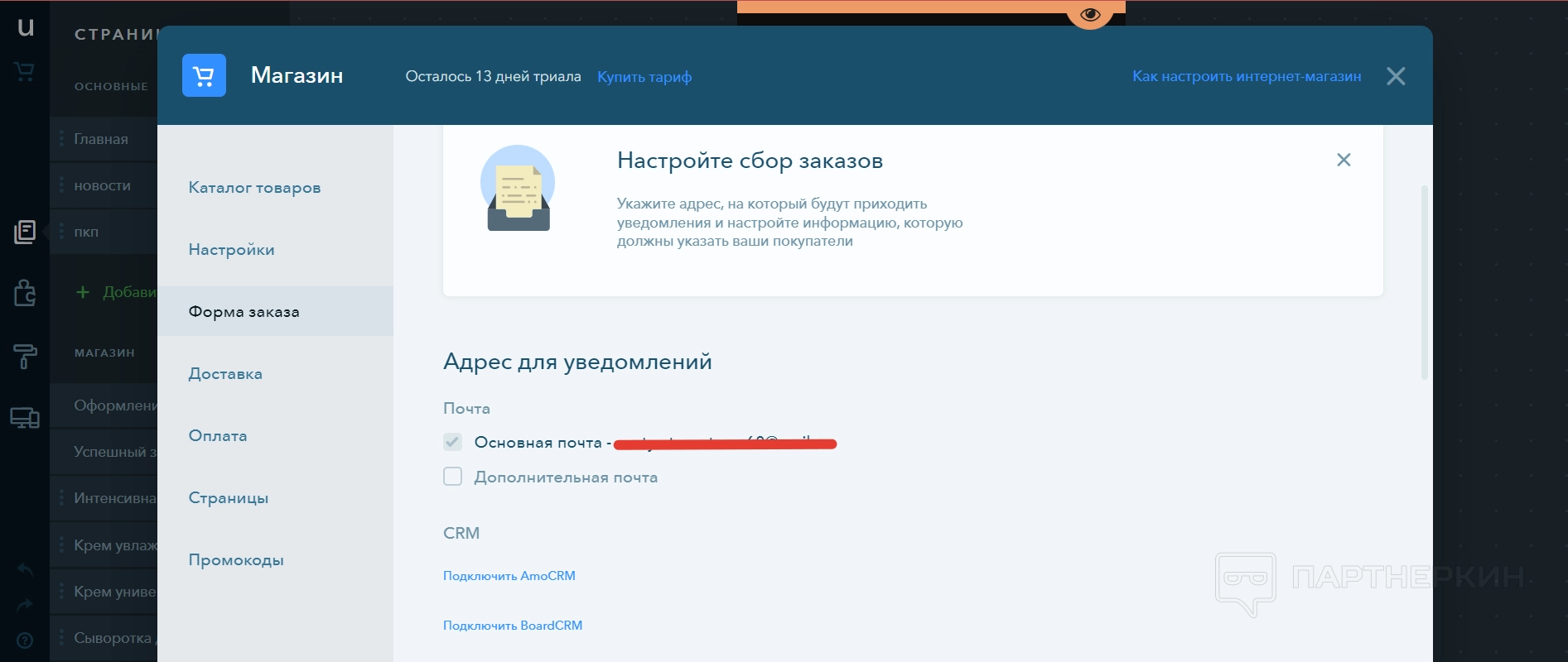 Форма заказа — в этом подразделе происходит настройка формы для пользователей при заказе, а также адреса, на который будут приходит данные о заказах. Пользователь может указать почту или добавить дополнительную, а также подключить CRM.