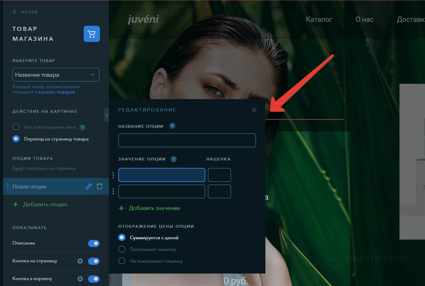 Например, можно указать значение опции как определенный цвет ткани товара. У зеленой ткани будет наценка, так как она производится из какого-то дорого материала, — ее и указывают в «Наценках». Ниже можно отметить, будет ли наценка суммироваться с основной суммой или показываться отдельно, например.