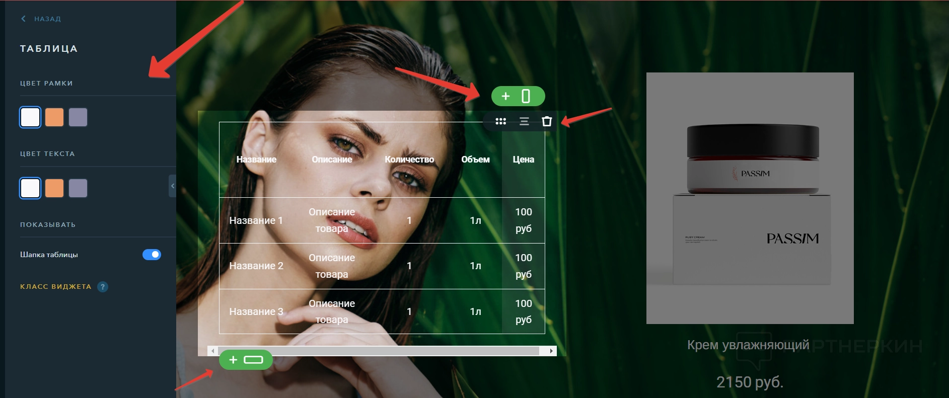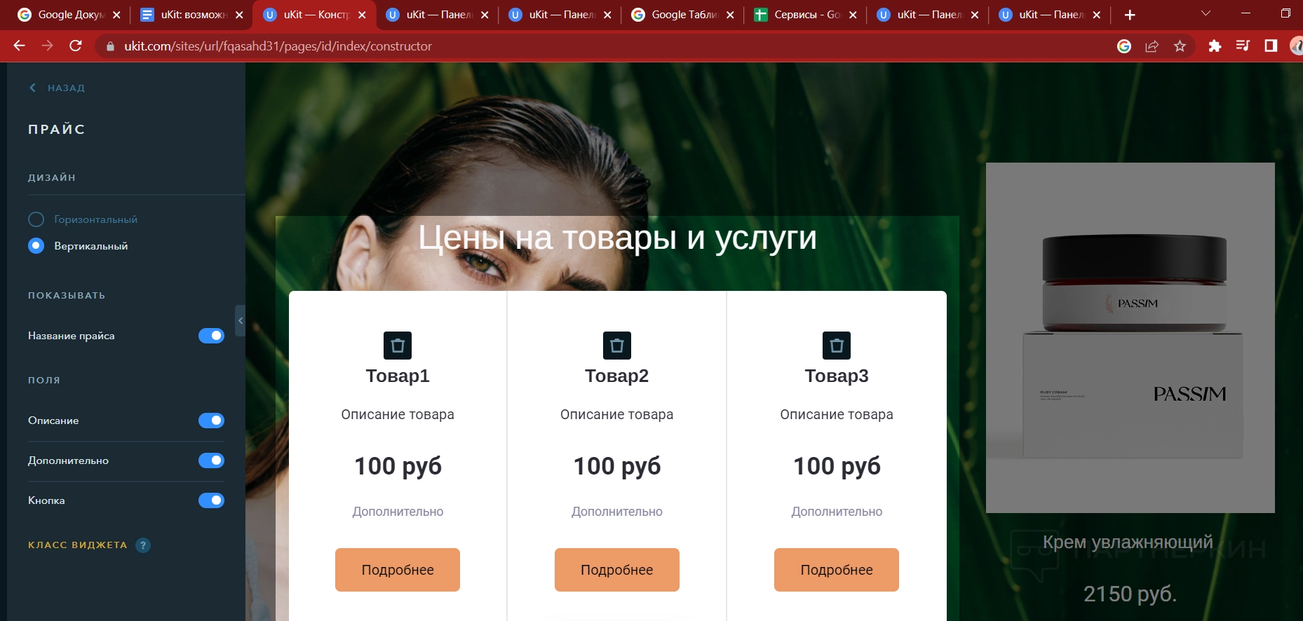 - Прайс — позволяет создать таблицу со сводными ценами на определенные товары. Чтобы изменить отображение таблицы, нужно откорректировать текст внутри нее, выбрать горизонтальное или вертикальное расположение и указать, какие колонки должны отображаться;
