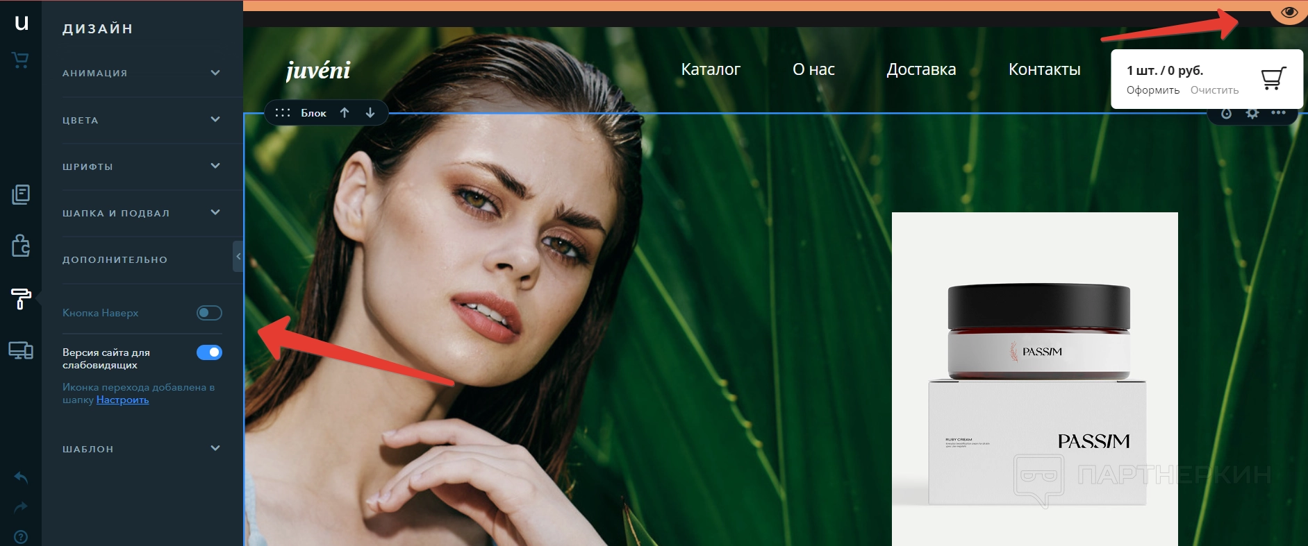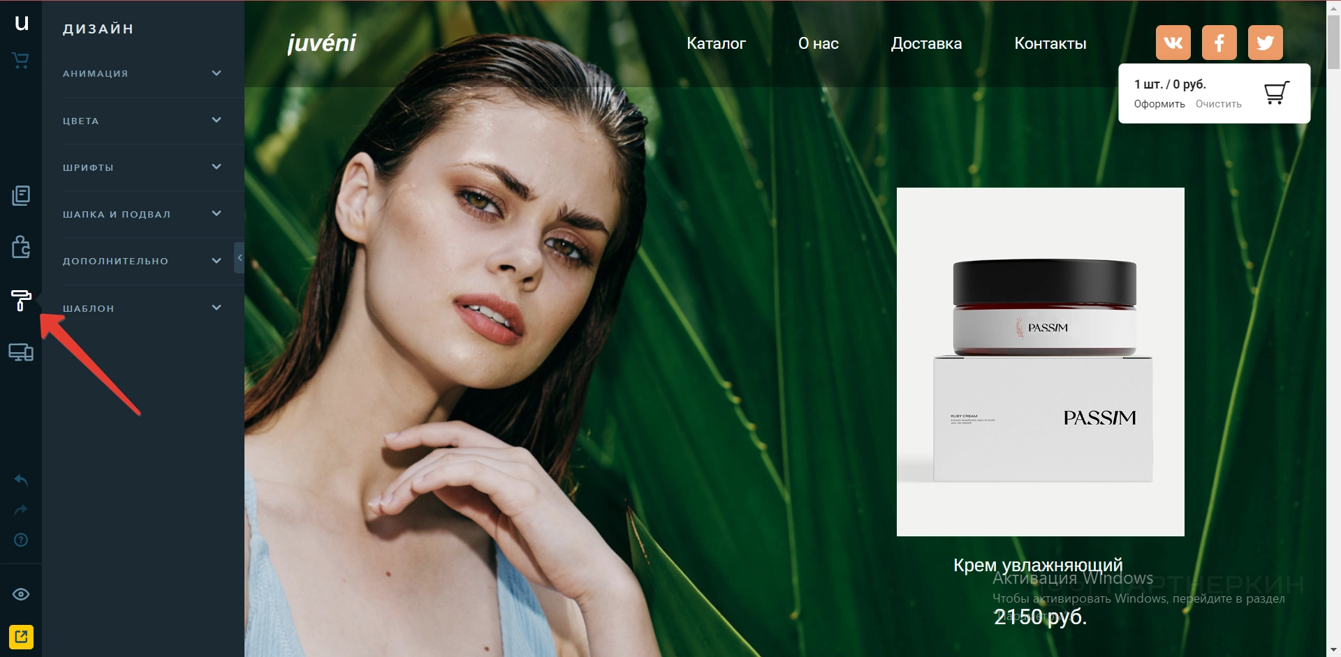 На этом функционал конструктора заканчивается. Теперь рассмотрим раздел с дизайном — он помогает уникализировать все элементы сайта пользователя.