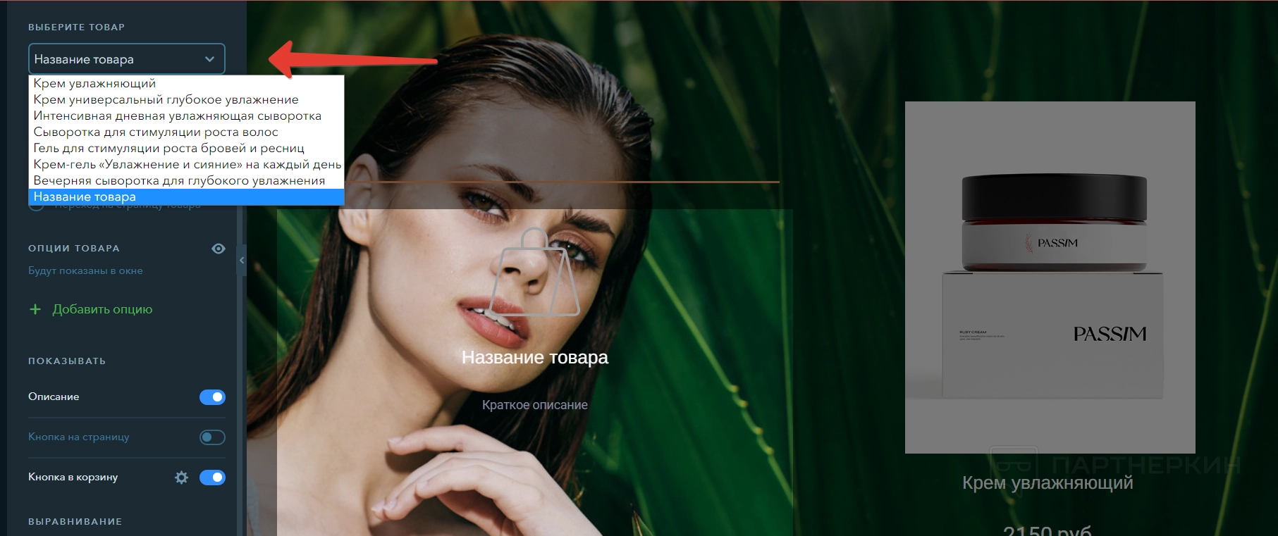 После переноса виджета можно тыкнуть на него и настроить детальнее. Например, можно выбрать карточку товара для отображения, которую пользователь уже добавлял в настройках магазина. Также можно создать новую карточку, и тогда она автоматически попадет в каталог товаров.