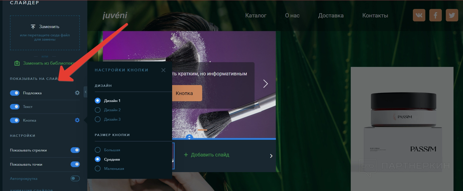 Слайдеры можно делать более интересными, если выбрать виджет «Слайдер». В таком случае настраивать можно не только изображение, ссылки, Seo или оформление стрелок и индикаторов, но подложку, кнопки и текст. Также настраивается дизайн подложки и кнопки — сам шаблон элемента и его цвет.