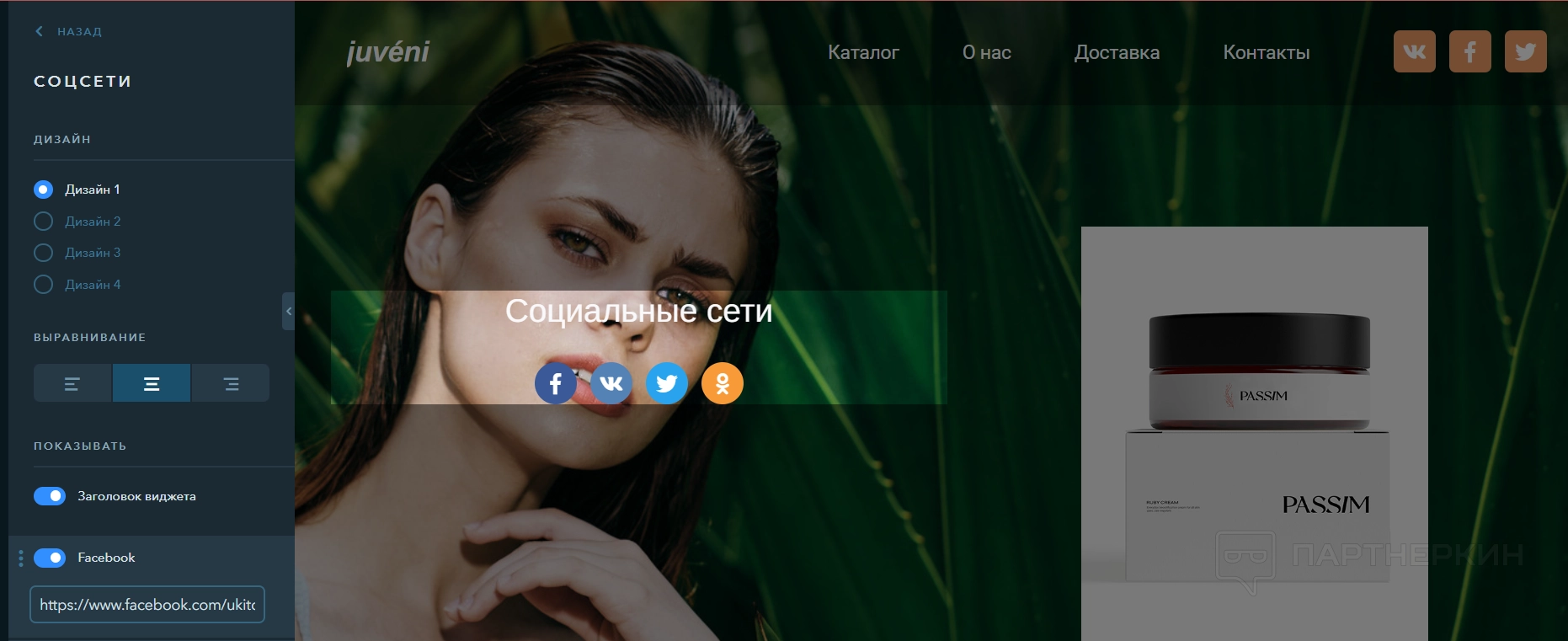 - Соцсети — через этот виджет можно привязать сразу несколько соцсетей. По умолчанию стоят четыре — Facebook*, Вконтакте, Твиттер и Одноклассники. Но можно добавить и другие — Google+, YouTube, Mail.ru, Telegram, Instagram* и прочие. Достаточно указать ссылку на аккаунт, по желанию можно выбрать вид дизайна и установить заголовок;