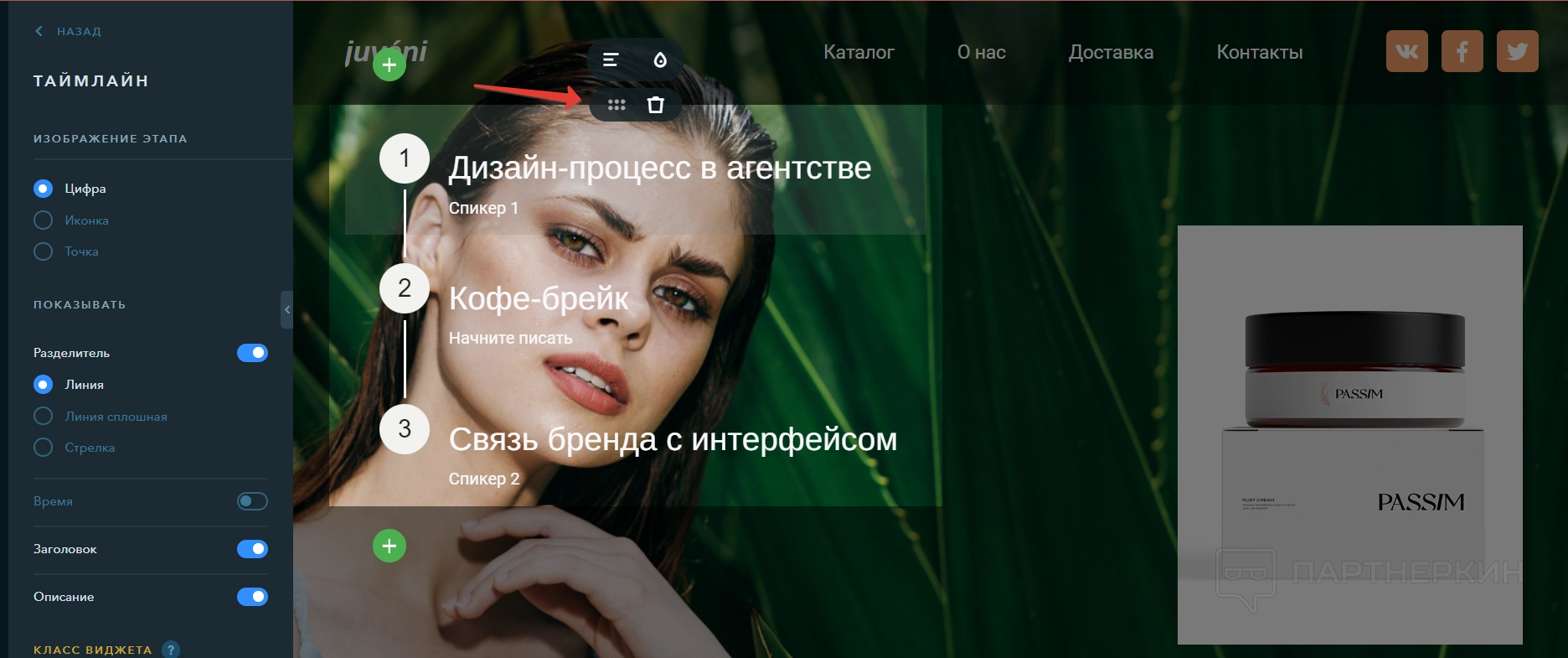 - Таймлайн — удобен для маркетинговых целей, так как позволяет обозначить прогресс или рост будущих клиентов. Для настройки виджета также нужно определить формат отображения цифр и разделителей между пунктами. Если нужно, отдельный блок можно менять местами с другими, а также их цвет, размер, тип и выравнивание;