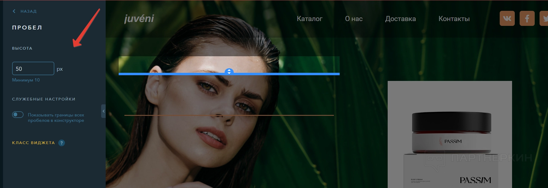 Структура — это следующий подраздел в конструкторе, который помогает добавлять элементы для разграничения отдельных виджетов или блоков на странице. На выбор доступно два варианта — это обычный пробел, а также разделитель.