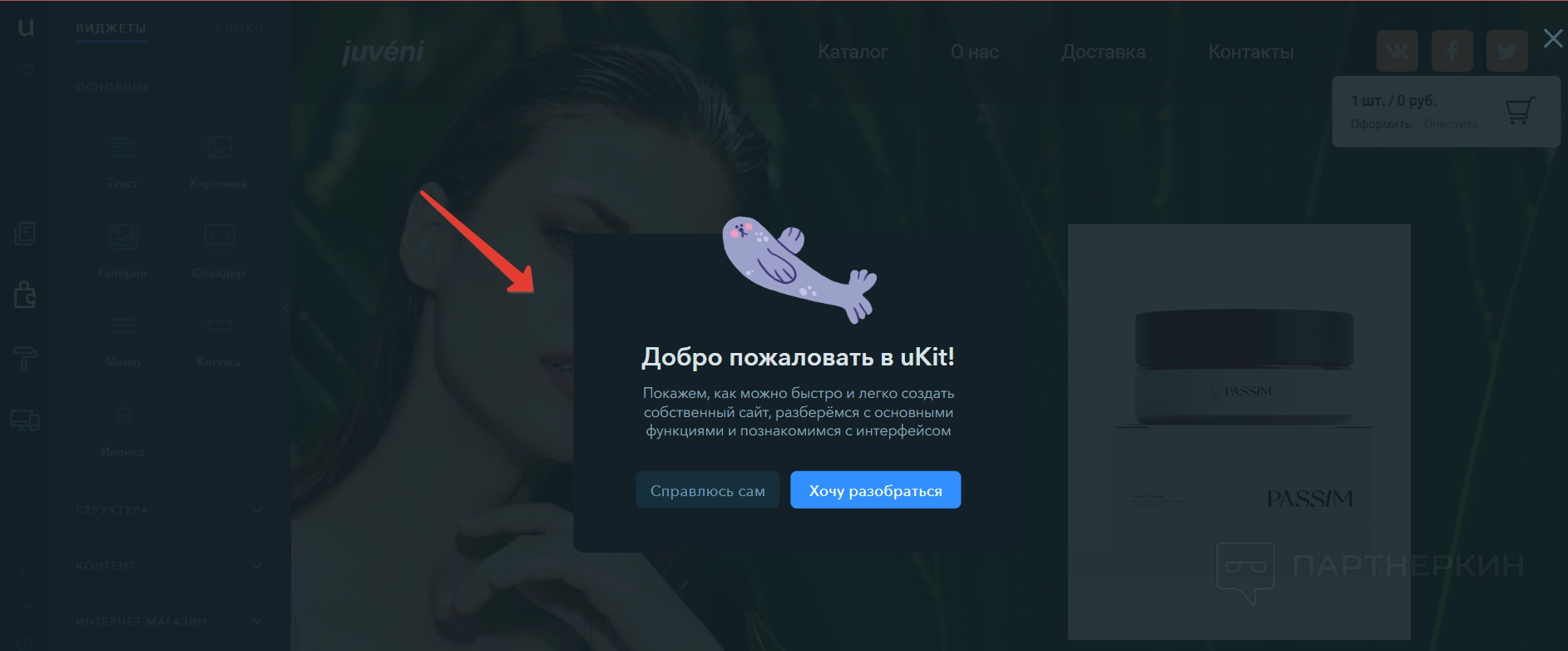 После того, как пользователь выберет подходящий шаблон, система предлагает ему пройти обучение функционалу конструктора или сразу перейти к работе.