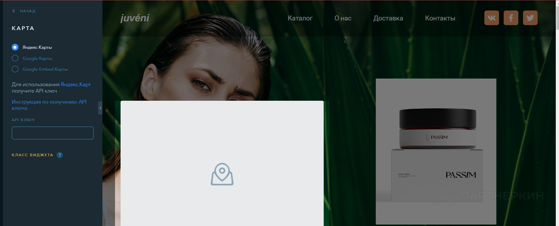 - Карта — можно добавить виджет карты отдельно, чтобы не привязывать его рядом с прочими контактными данными. Чтобы настроить функцию, придется указать API-ключ от Яндекс-карт, Google-карт или Embed-карт;