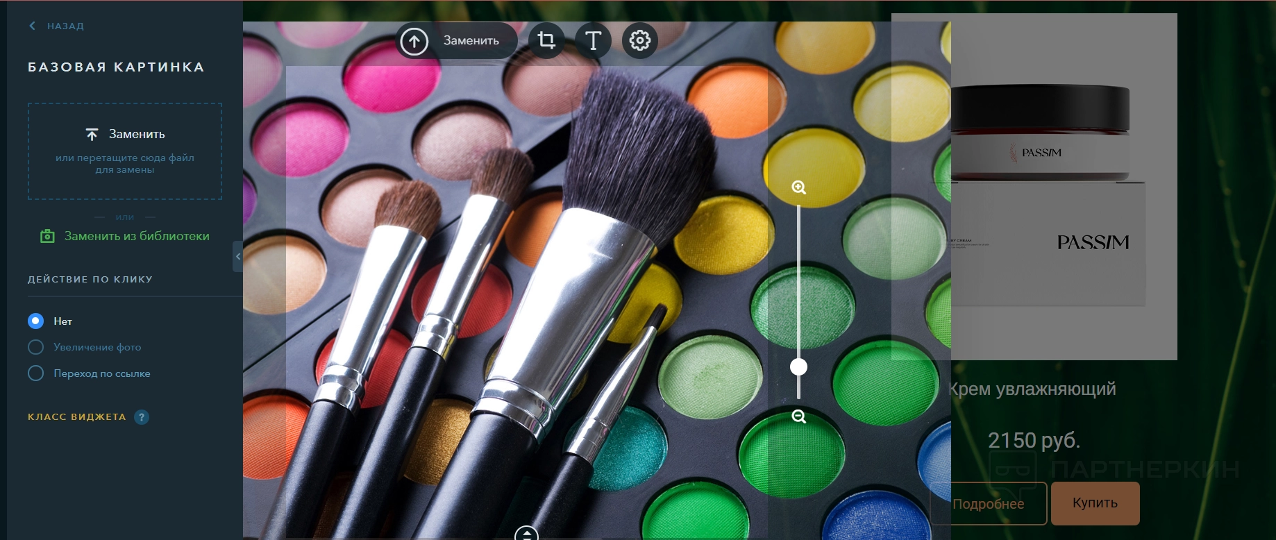 Здесь же можно настроить действия на картинке, если пользователь нажмет на товар — можно либо сделать так, чтобы картинка увеличивалась, либо так, чтобы система переводила пользователя на страницу с оформлением товара.