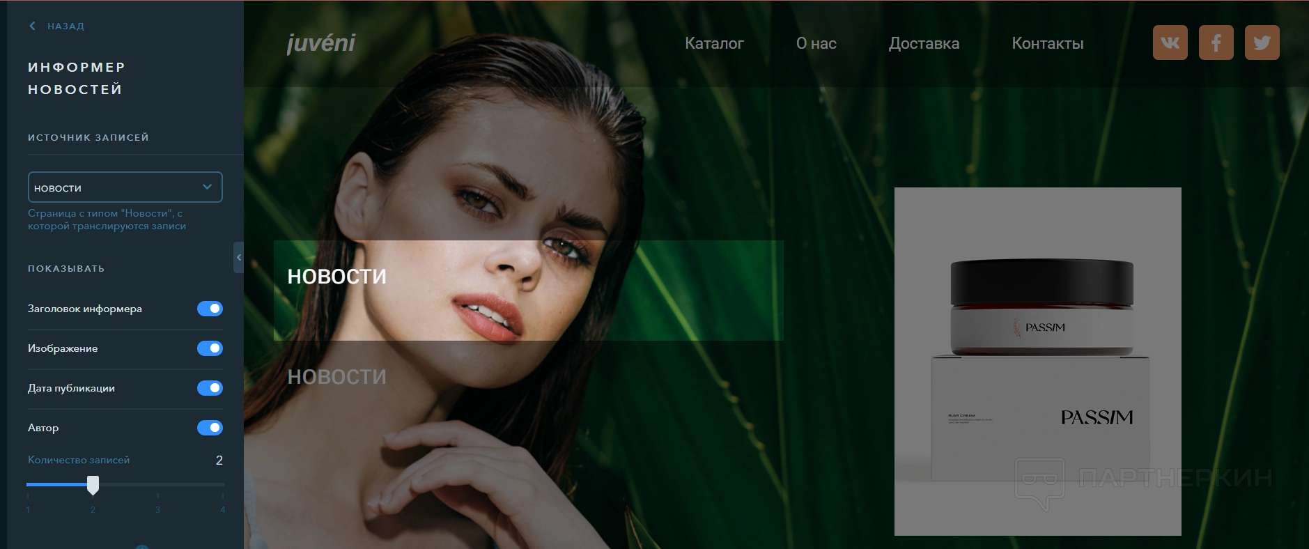 - Информер новостей — это виджет, который будет показывать часть новостей и пересылать на ключевую страницу с ними. Поэтому для его использования нужно создать такую страницу в редакторе страниц. После установки можно настроить отображение виджета — наличие заголовка, изображения, даты публикации и автора, а также количество транслируемых новостей;