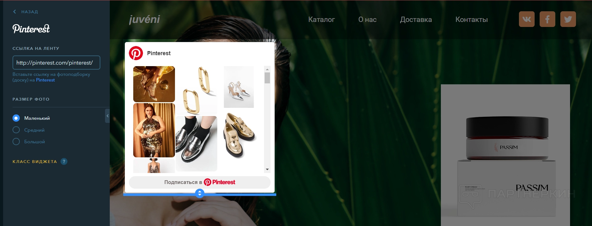 - Пинтерест — с помощью виджета можно показывать нарезку изображений определенной ленты в Пинтересте. Для этого нужно добавить ссылку на ленту, а также определить размер изображений — маленький, средний или большой;