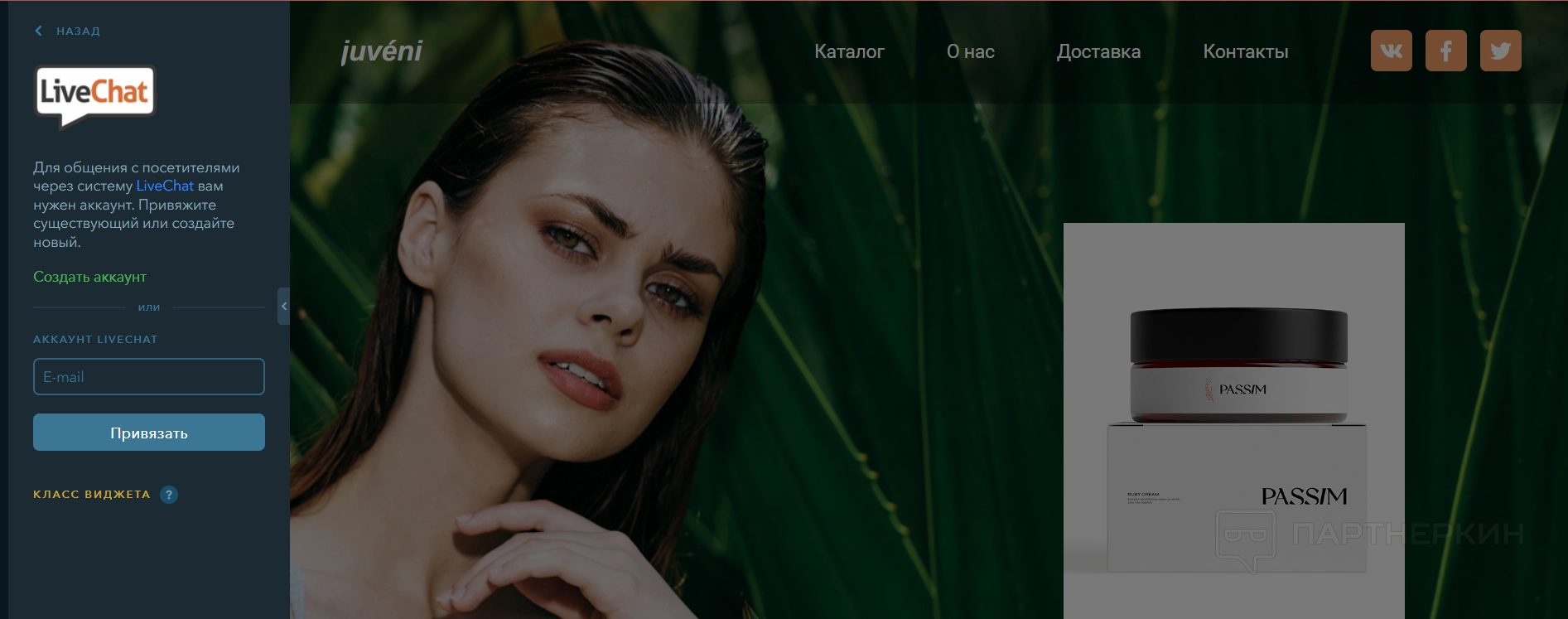 - LiveChat — этот виджет помогает создать иконку с живым чатом, чтобы каждый мог быстро получить ответ на свой вопрос. В настройках придется указать почту, к которой привязан аккаунт LiveChat;