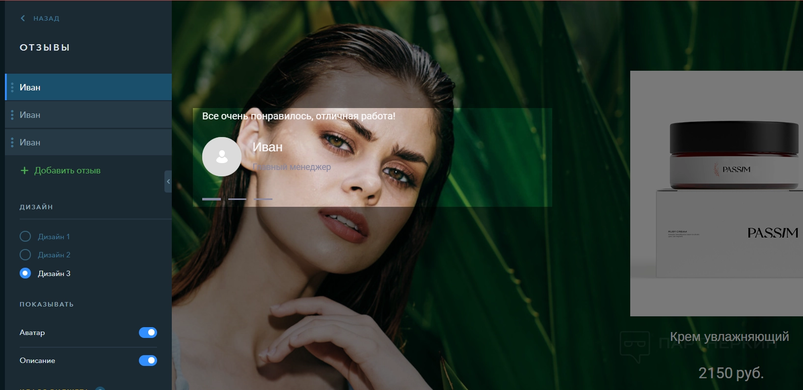 - Отзывы — полезный виджет, который позволяет добавить отзывы на страницу в формате слайдера. В настройках можно установить, сколько именно отзывов будет, и кому они принадлежат. Можно изменить стиль слайда по необходимости, а также убрать или добавить описание тому, кто оставлял данный отзыв;
