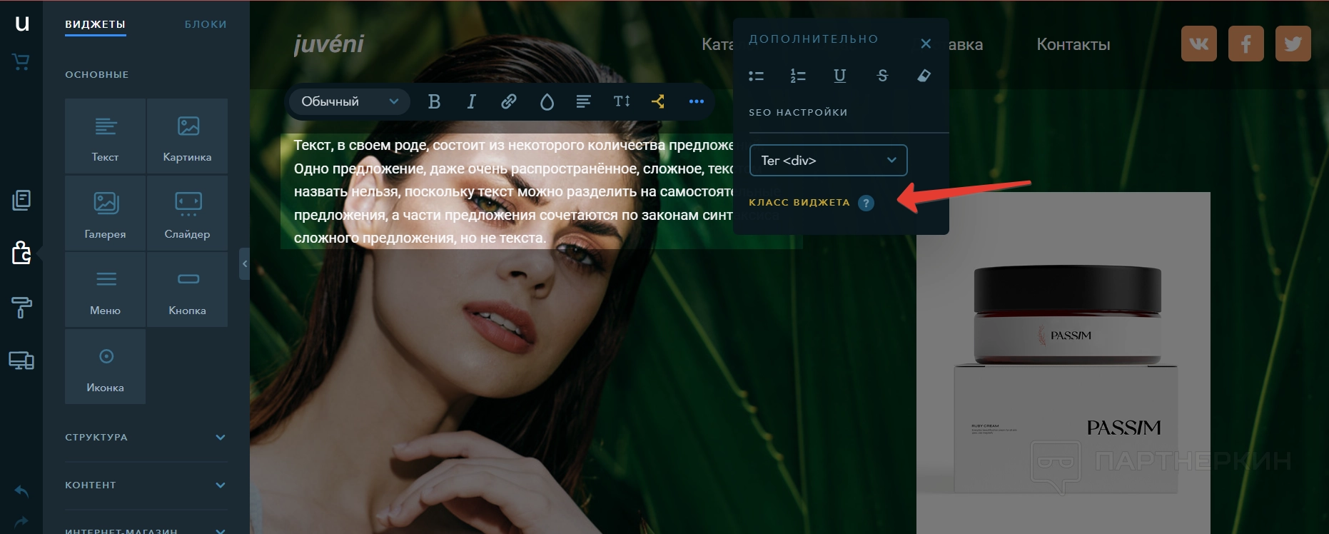 В этой панели задается и класс виджета — эта функция нужна для тех, кто хочет привязать текст к коду CSS или JS. В этом случае дальнейшая настройка кода будет происходить через виджет «HTML-код» или «Свой код».