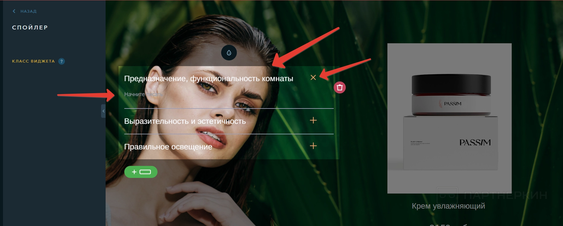 - Спойлер — это элемент, который позволяет создавать список пунктов с выпадающим списком. Для редактирования достаточно ввести текст самого пункта, нажать на плюс и указать текст, который будет отображаться в выпадающем списке. По желанию можно изменять цвет отображения;