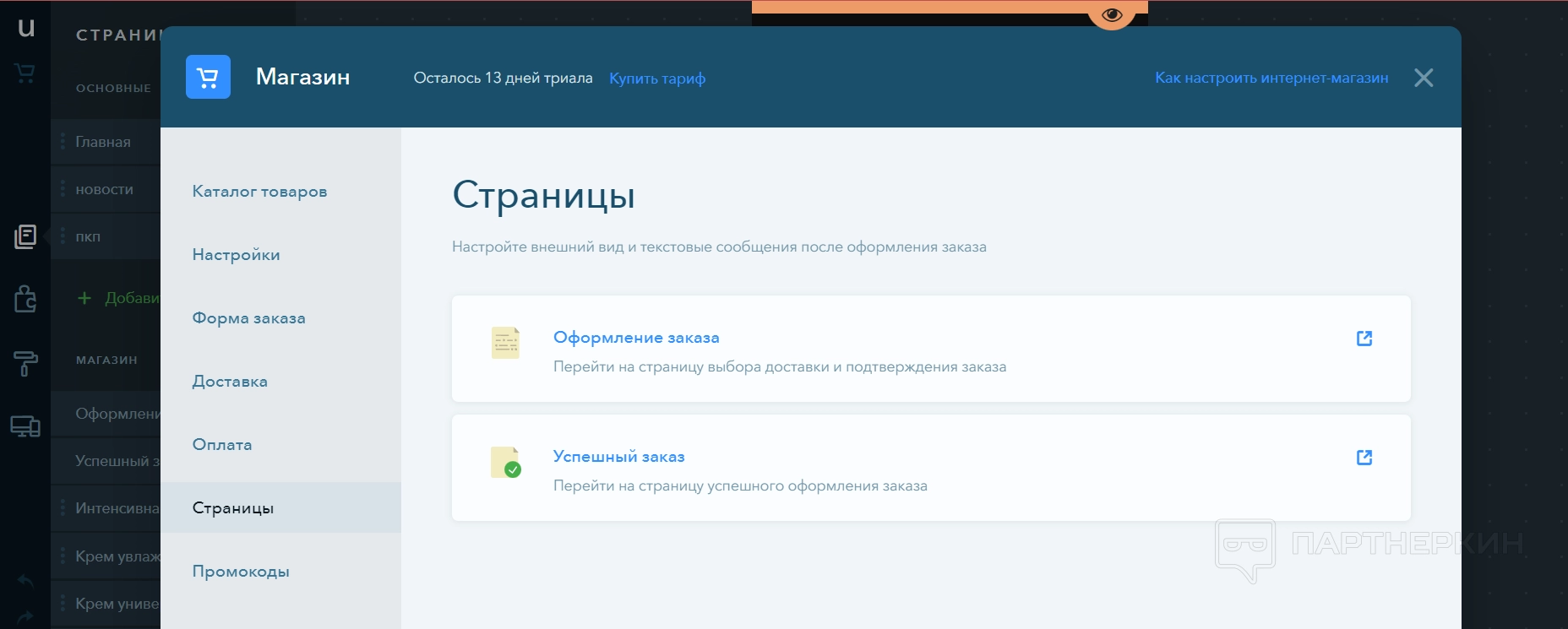 Страницы — через этот подраздел можно оформить, как будет выглядеть страница оформления заказа, а также страница успешного заказа. В обоих случаях система сразу перебросит пользователя в конструктор, где и происходит вся настройка данных и дизайна.