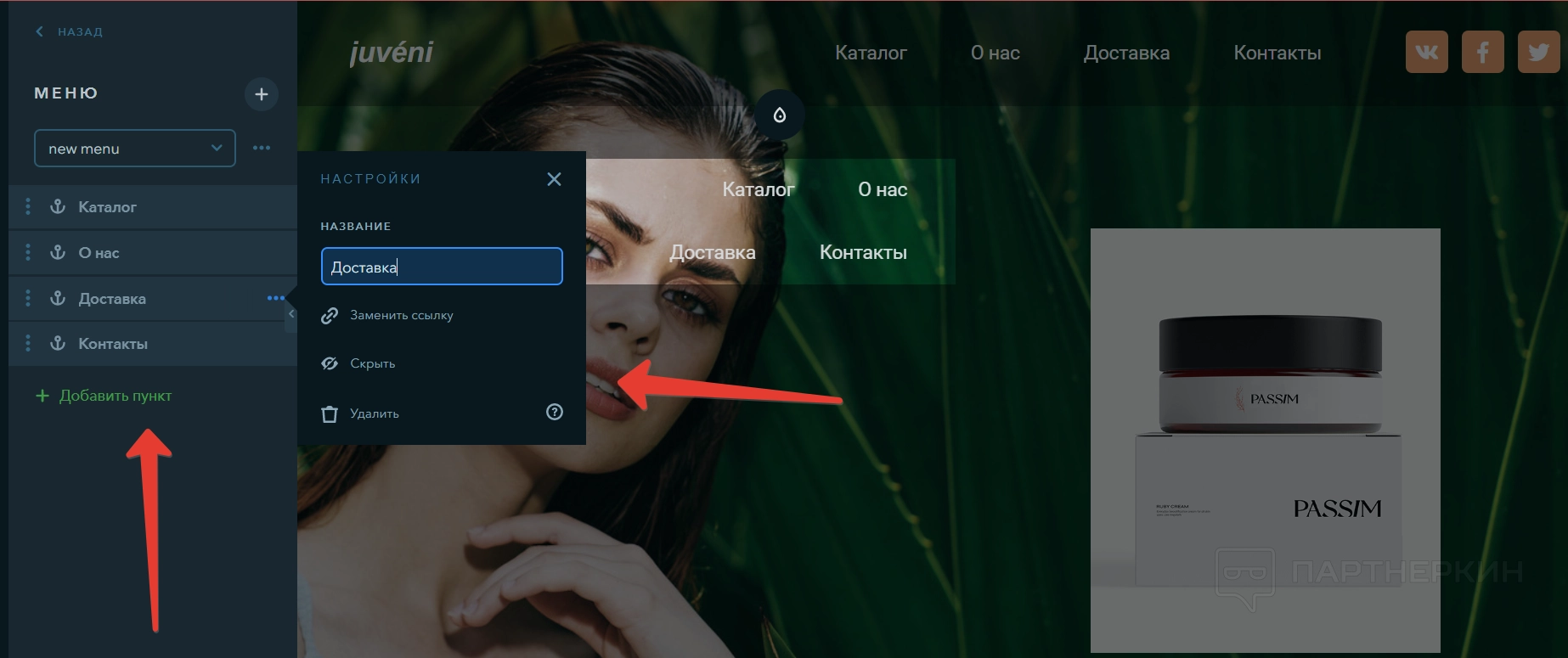 Следующий виджет — это меню, то есть список всех блоков на странице, который отображается в хедере страницы. В настройках можно изменять само название меню, название отдельных блоков, а также добавлять новые или удалять старые. Кроме того, здесь редактируются сами ссылки, которые вшиваются в слово с названием.